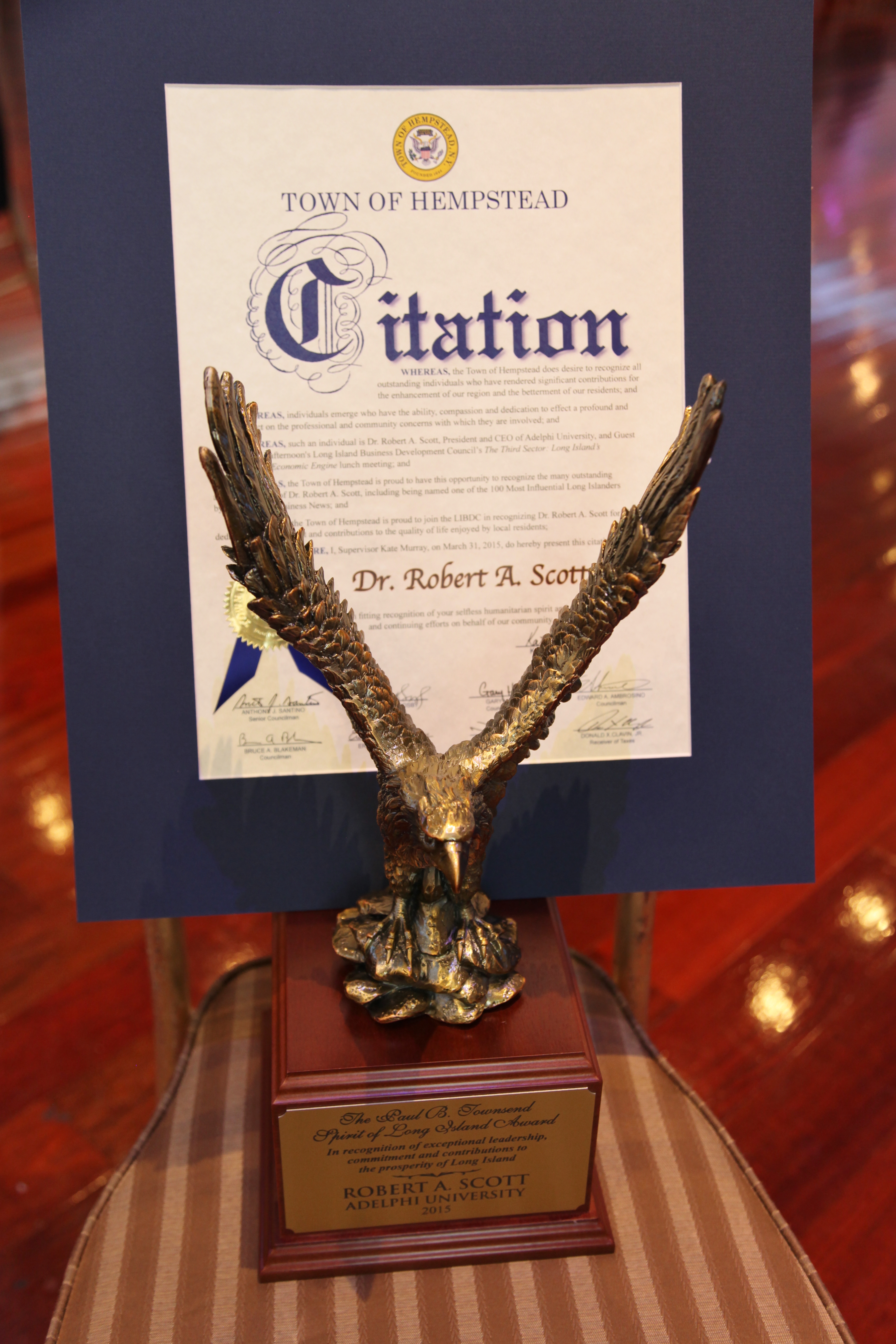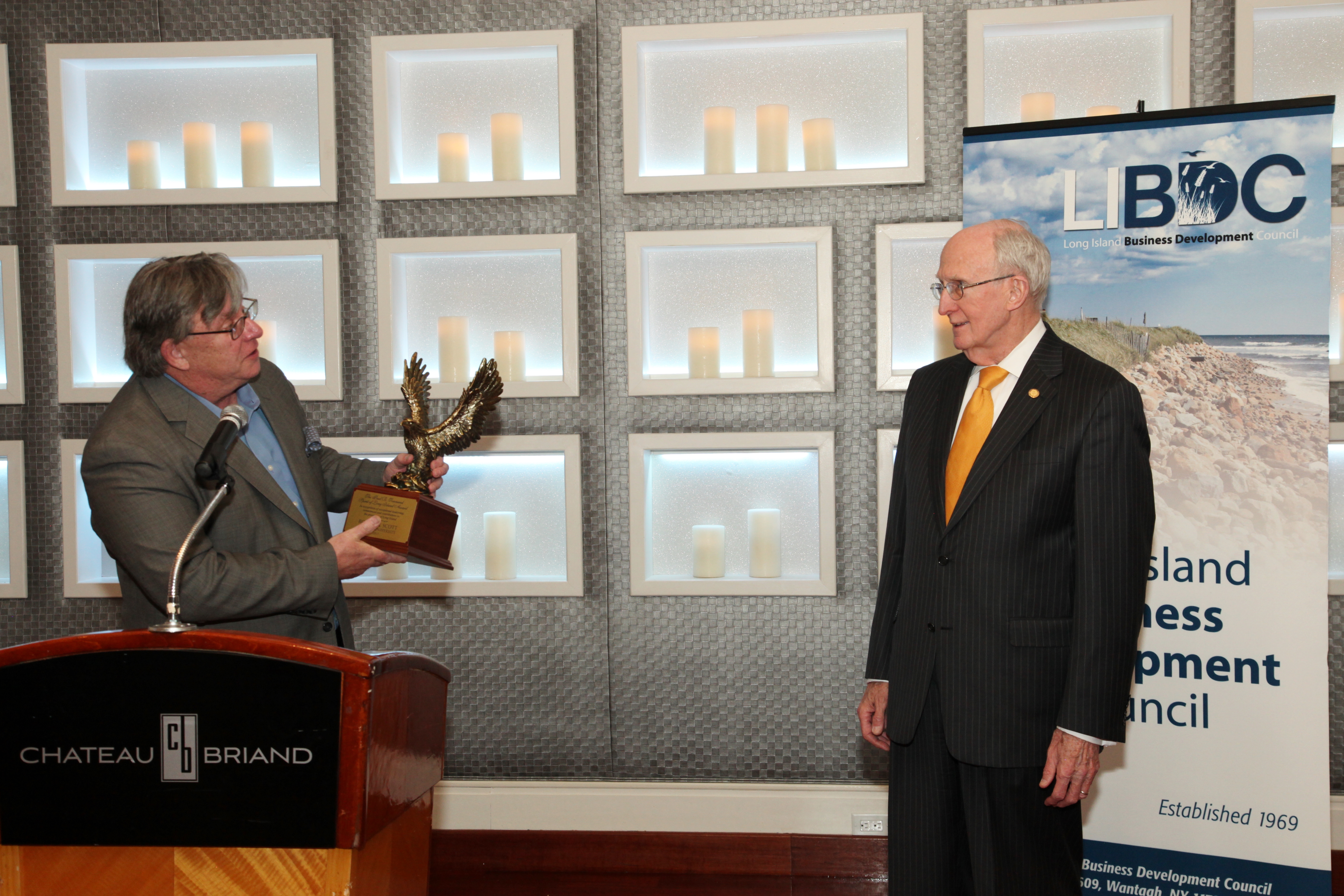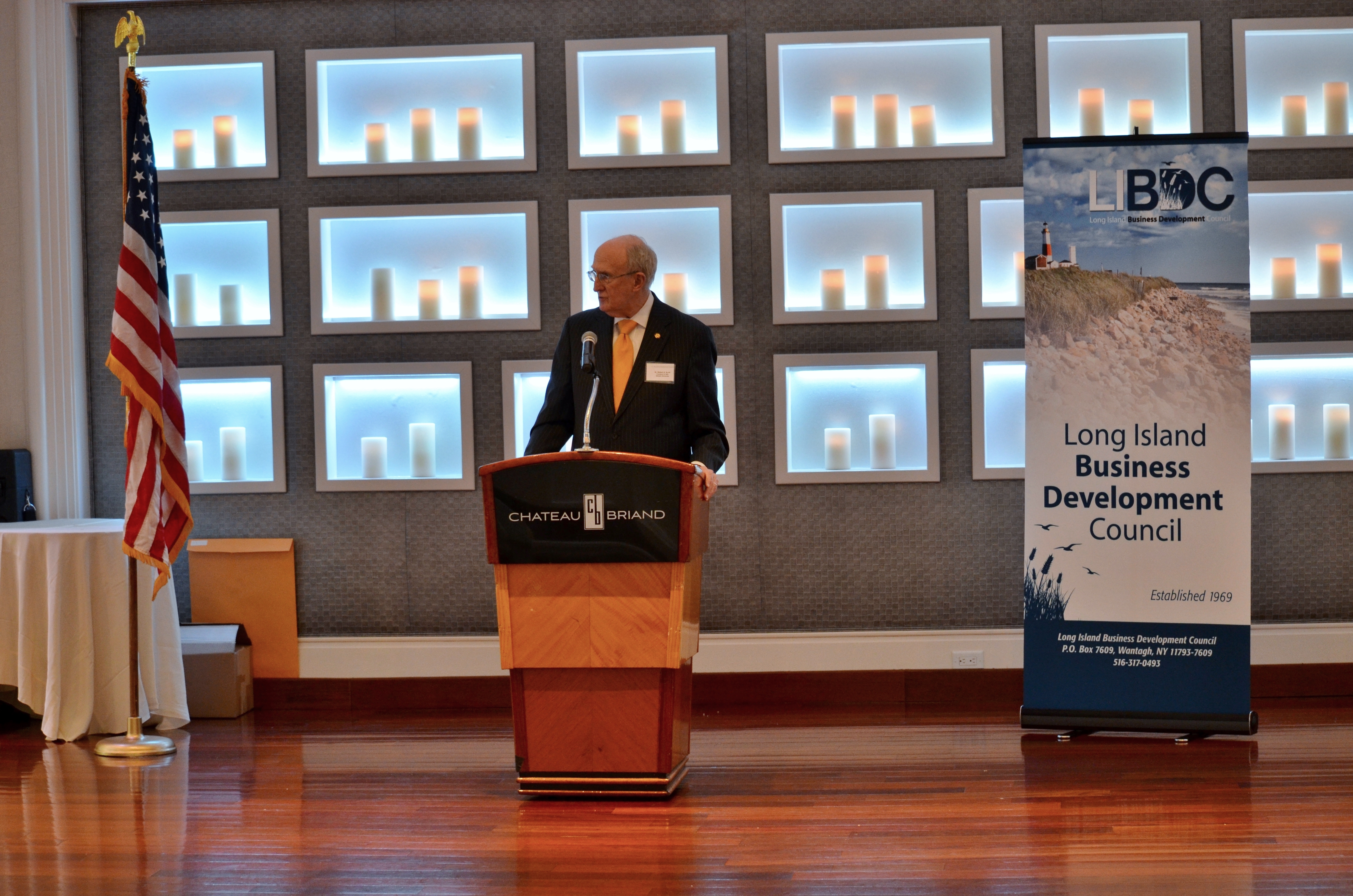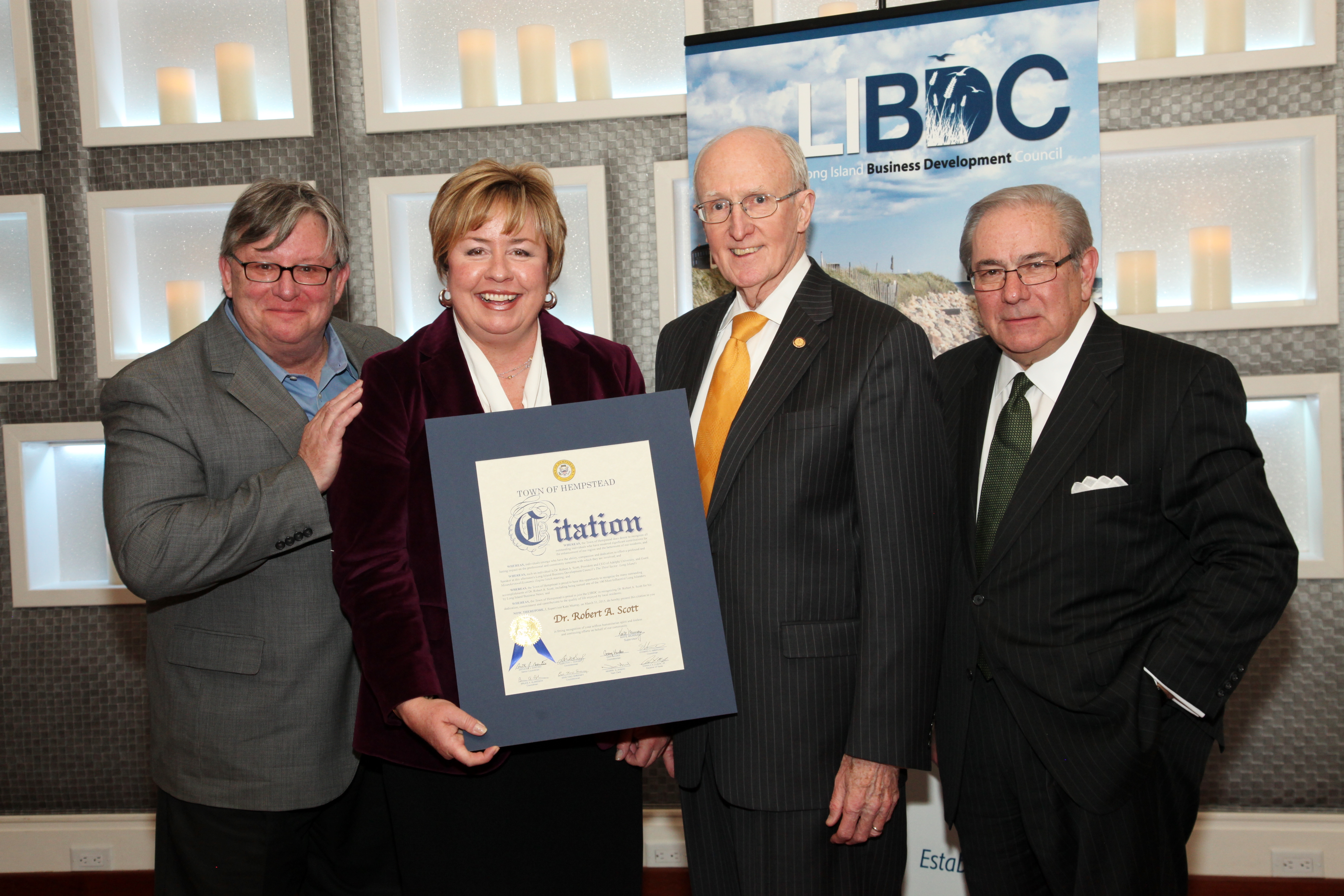 John Kominicki, the group’s co-chair, introduced the keynote speaker, Dr. Robert A. Scott, President and CEO of Adelphi University who led an informative discussion on the Not-for-Profit sector and its impact on the Long Island economy. Dr. Scott was then presented with the LIBDC’s Spirit of Long Island Award as well as a Citation from the Town of Hempstead.